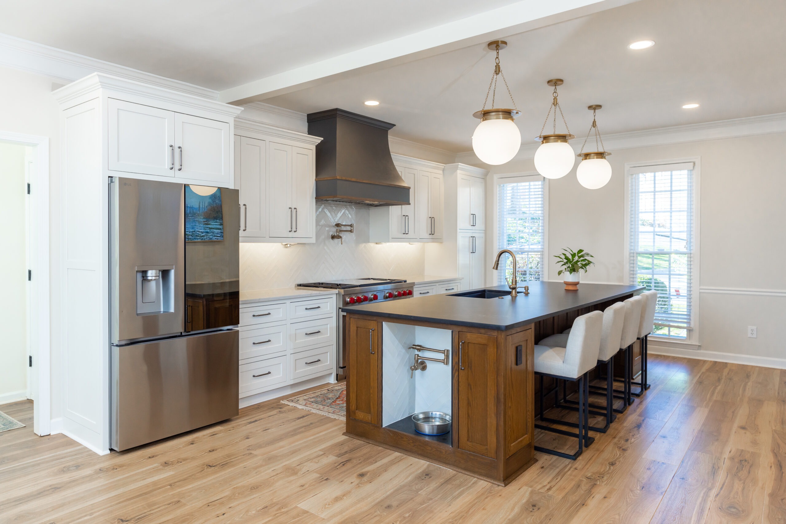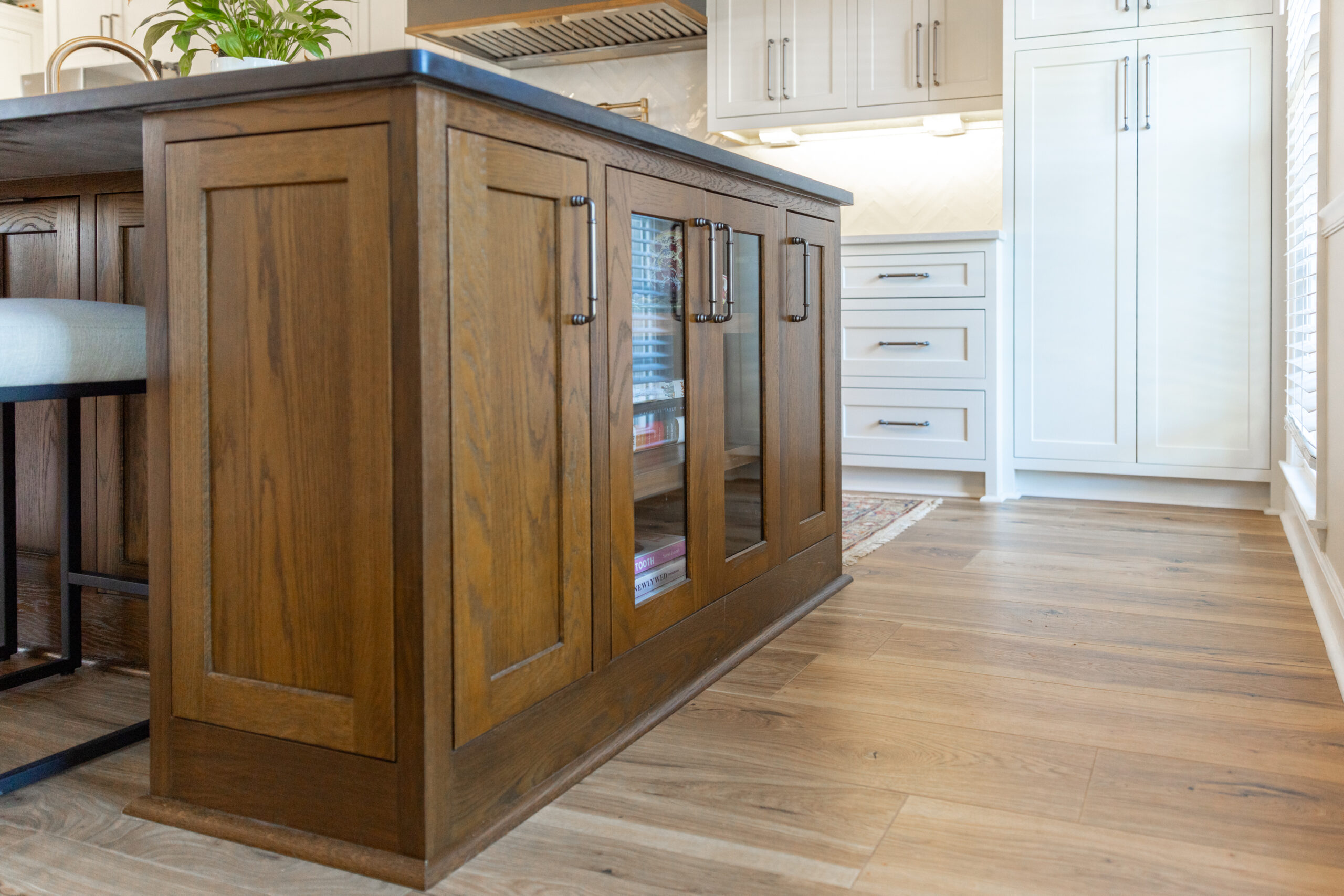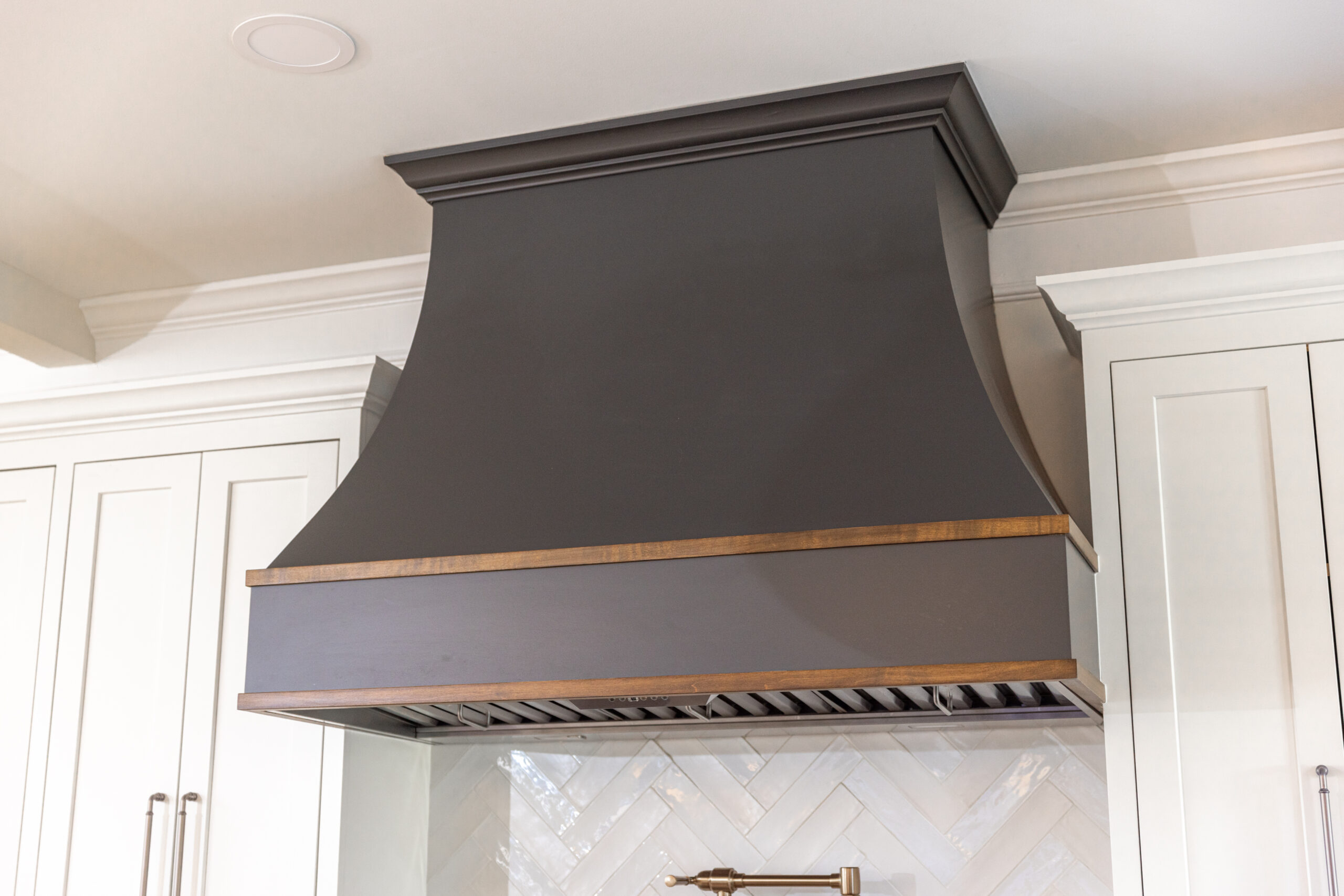 Outside Cabinets - Ben Moore Alabaster (OC-129, Island Custom Stain, Hood - Sherwin Williams Iron Ore (7069)