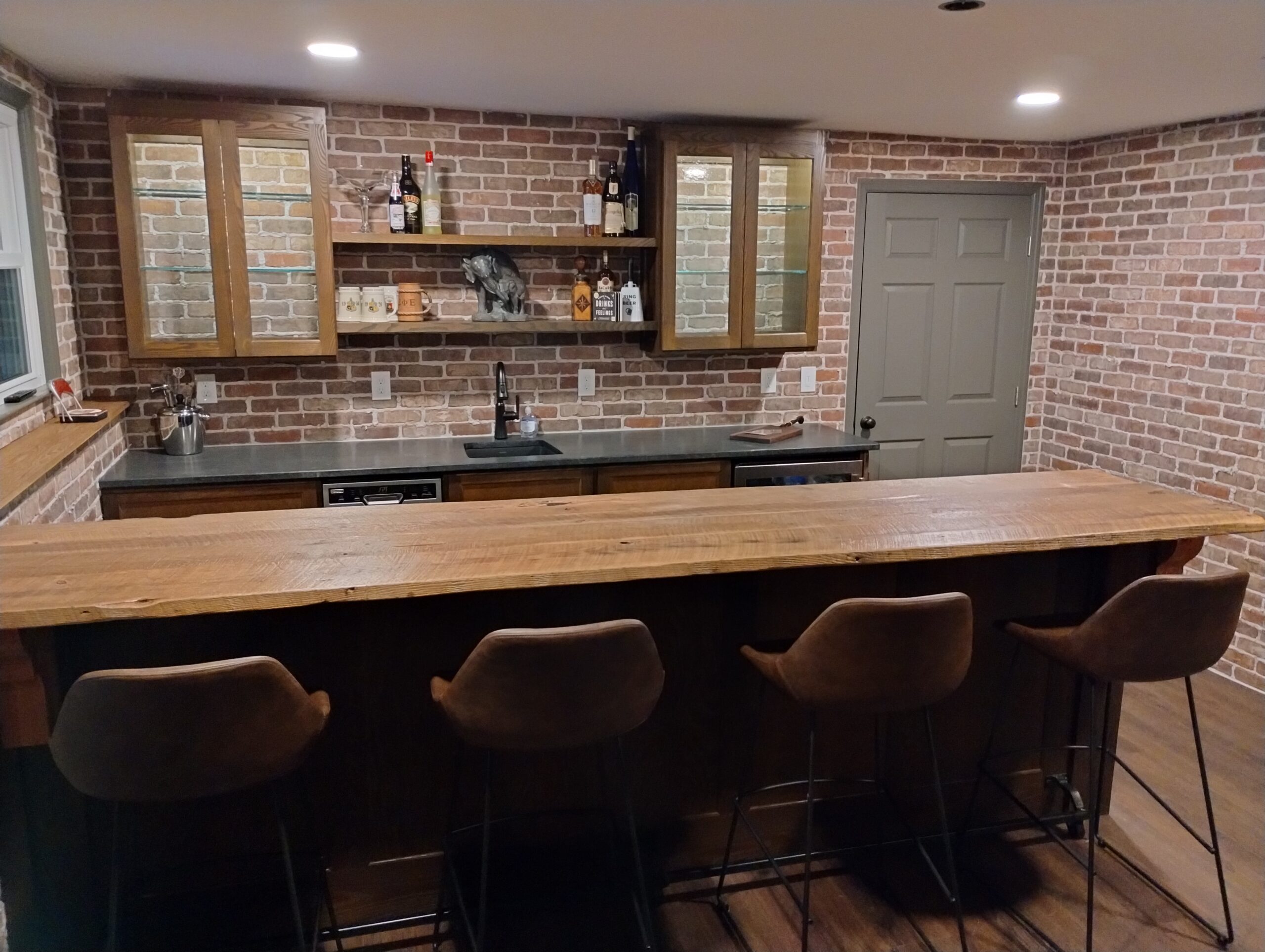 The reclaimed wood bar top came from another area craftsman, Brandon Watts at Revival Timberhaus. Thank you for the awesome contribution to this build!